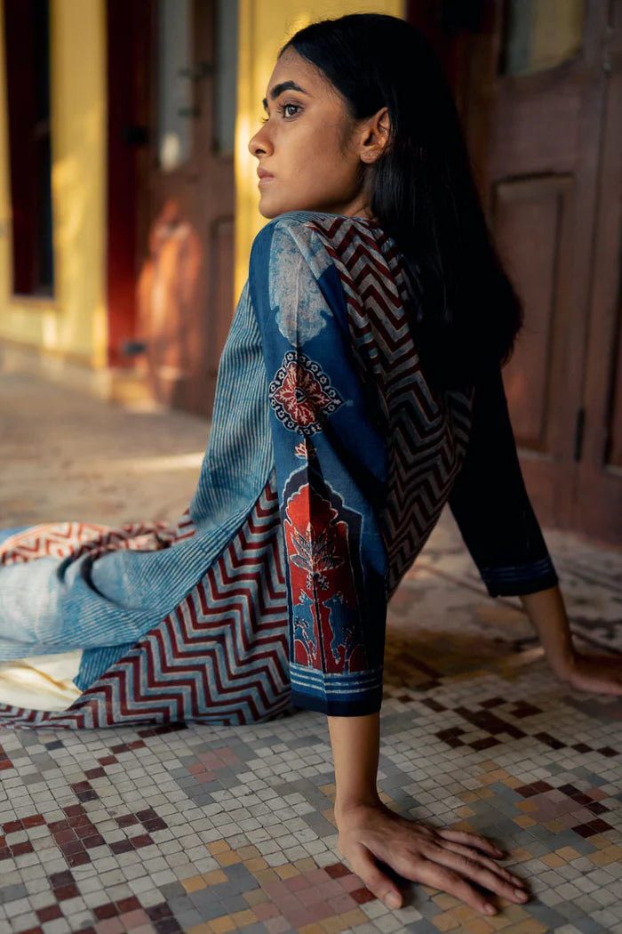 Indigo & Maroon Ajrakh Patch Panel Cotton Kurta