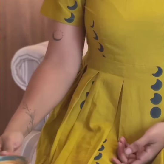 Step into effortless elegance with this beautifully crafted mustard yellow A-line dress. Designed with a flattering, flowy silhouette, this dress features subtle pleats and a graceful knee-length cut that moves beautifully with every step. The minimal yet artistic crescent-inspired printed detailing adds a unique charm, making it perfect for both casual outings and relaxed gatherings.