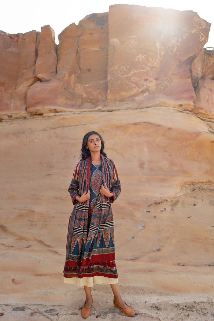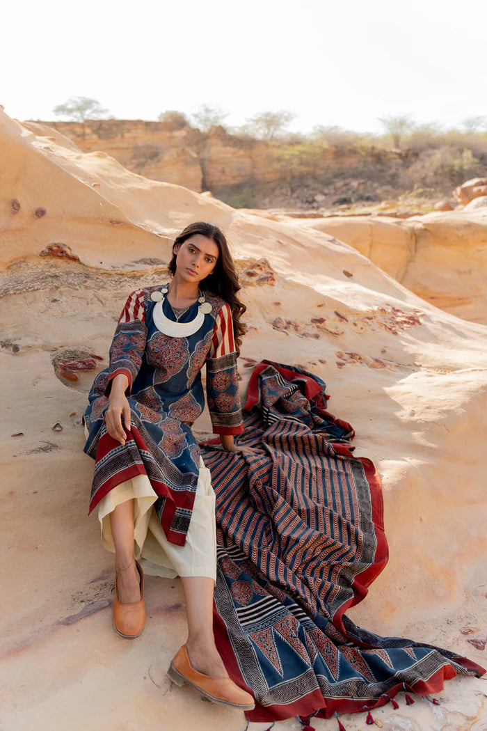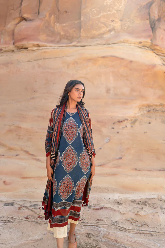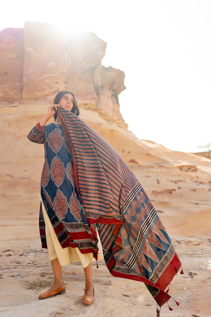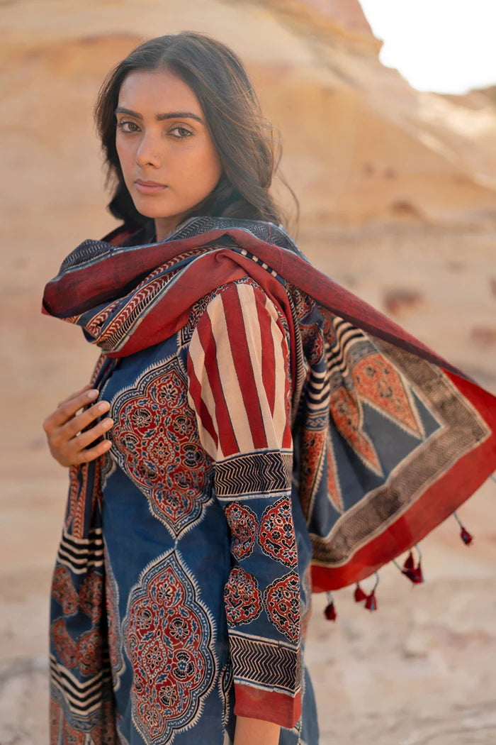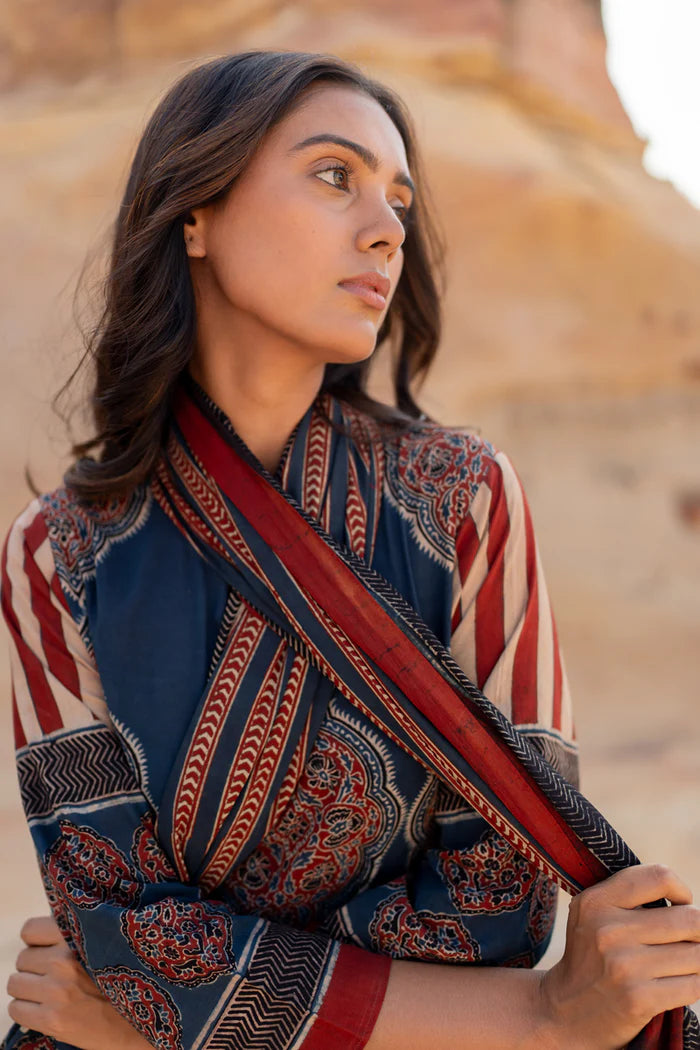 Ethnic Printed Cotton Kurta Set With Dupatta – Blue & Maroon